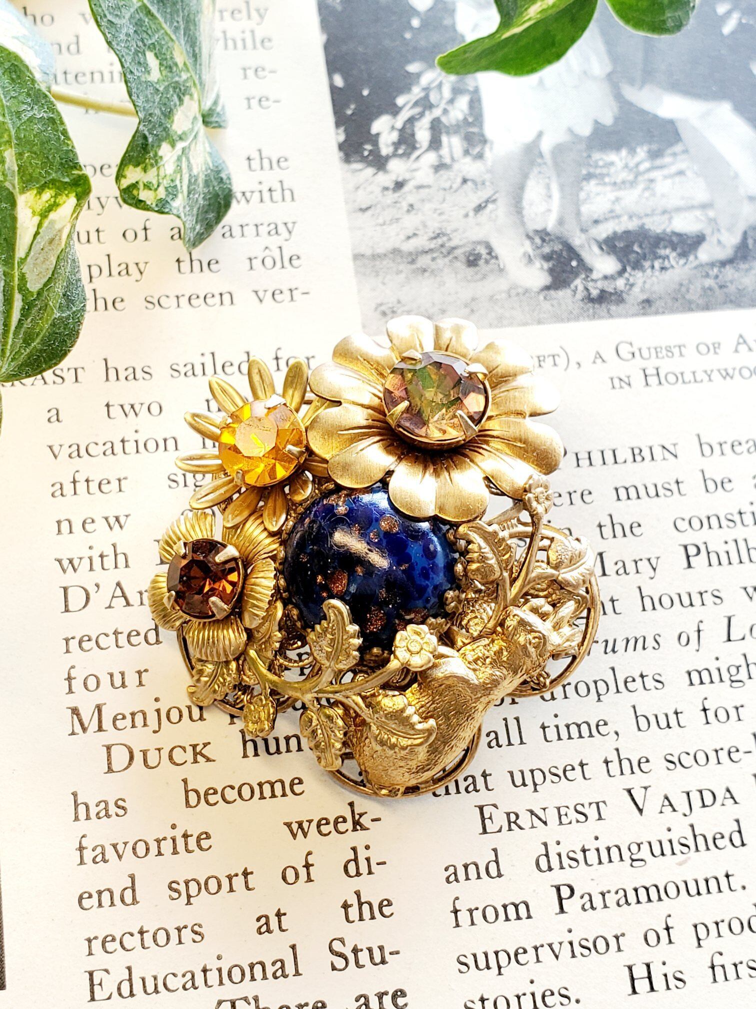 繊細な花と寄り添う兎のモチーフが、可憐さと物語性を添えるブローチです。