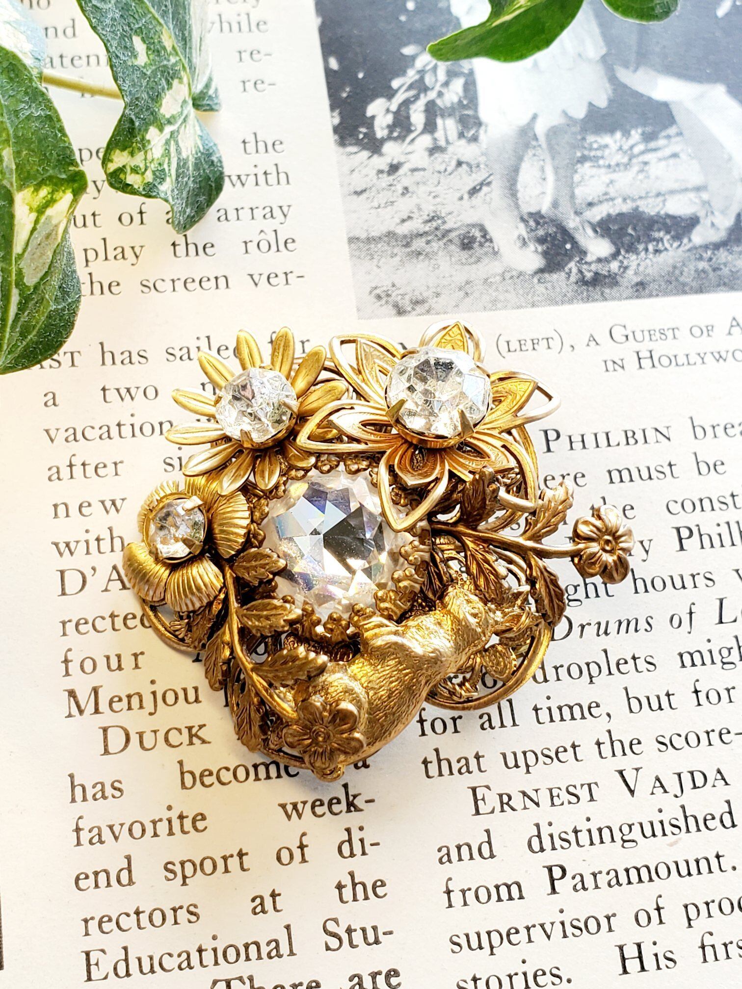 繊細な花と寄り添う兎のモチーフが、可憐さと物語性を添えるブローチです。