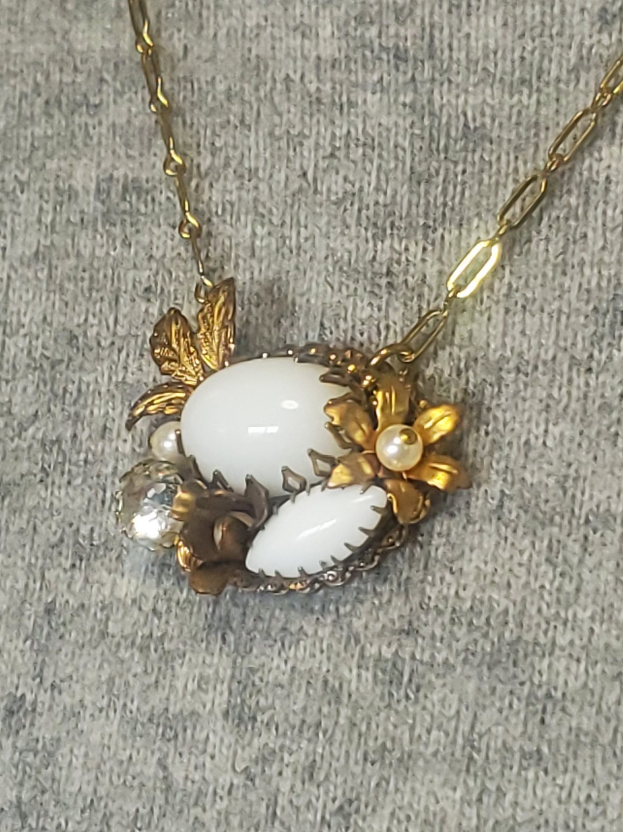 ドイツヴィンテージのミルクガラスとアメリカの真鍮で出来たリーフのスタンピングでクラシカルなペンダントが出来ました。(真鍮は汗に弱いです。また、肌の弱い方はかぶれてしまう可能性があります。なるべく洋服の上からのご利用をお勧め致します。)